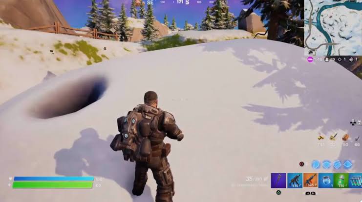 To the west of Frozen Tilted Towers (Frosty Fields), an interesting interaction takes place that gives insight into the weeks ahead in Chapter 3 Season 1. Between the snowy hills beside Frosty Fields, a massive pile of snow can be seen with a small hole near one side.