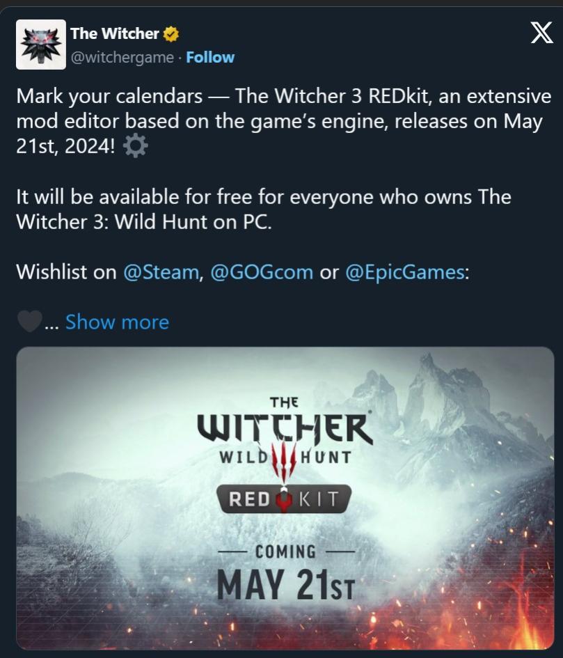 The Witcher 3: Wild Hunt para PC podrá usar el soporte oficial para mods "REDkit" a partir del 21 de mayo de 2024, según ha anunciado CD Projekt Red.