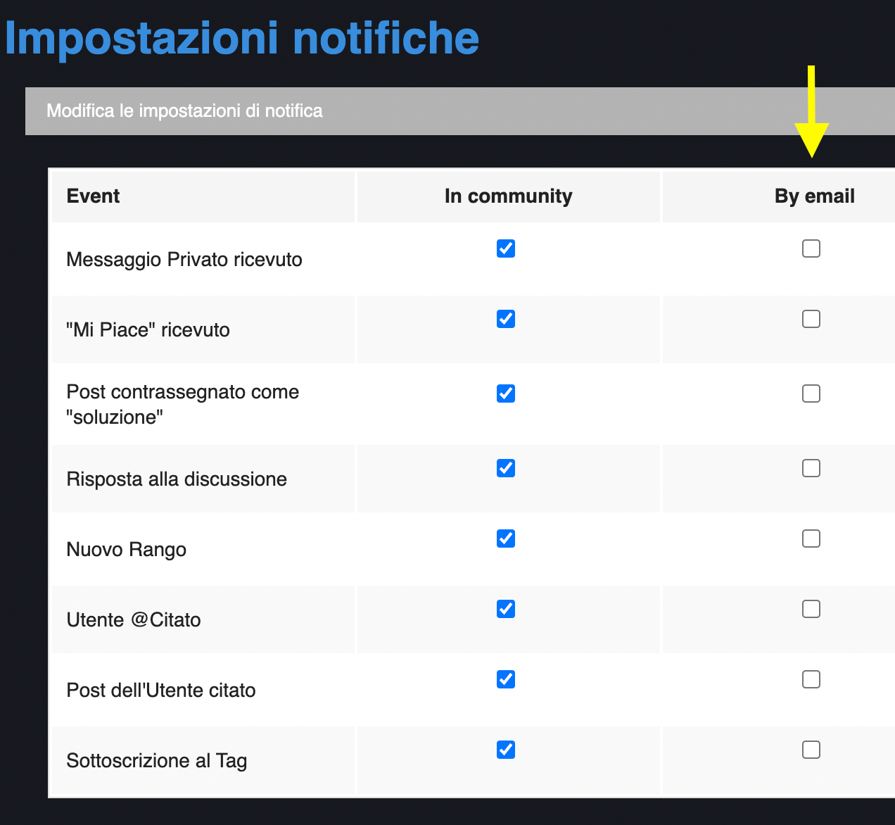 Rimuovere la spunta dalle caselle sotto le notifiche “By email”