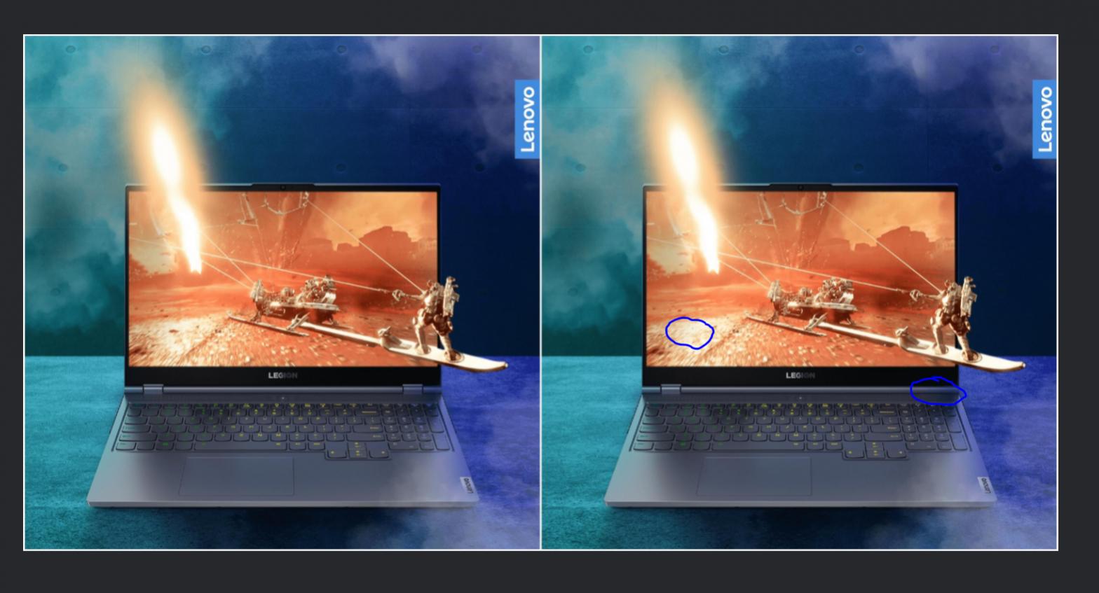 Well, what I can see is the Fn key has no lettering on the right picture and on the left it does. Secondly, the rock in the first pic is visible and in the second it's not.