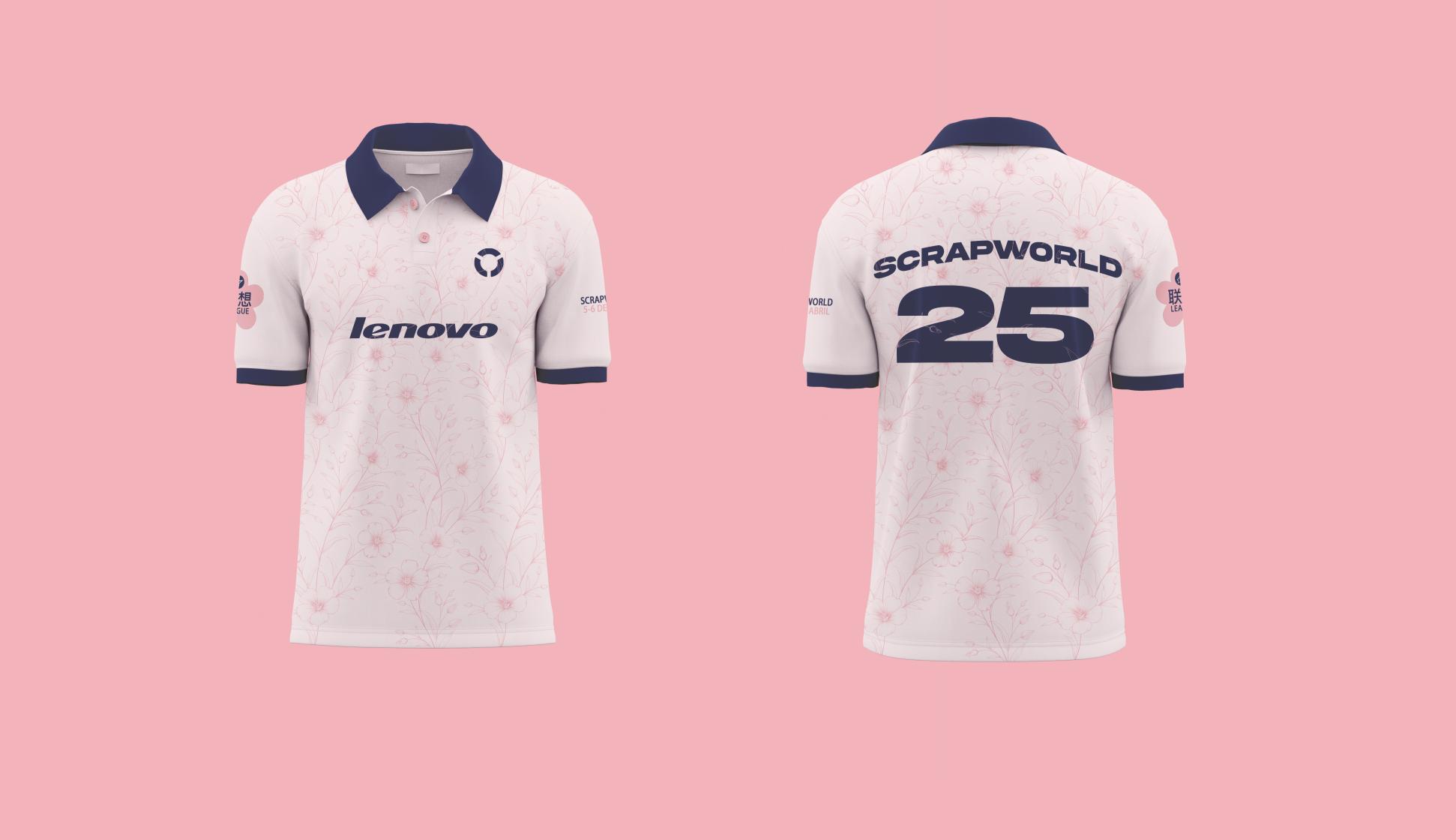 Y por último, la que más tiempo me ha llevado con el segundo logo de Lenovo que me pareció que podría quedar muy bien al ser una camiseta retro, pero que se podría modificar para poner el actual sin problema. El patrón de las flores se integra entre los demás elementos en azul de la camiseta. En las manga derecha he añadido de nuevo el nombre de Lenovo original como si fuese una liga en la que juega este equipo, haciendo referencia a los parches que tienen las camisetas de fútbol de cada liga. Y en el brazo izquierdo, la fecha del evento con el nombre del evento.